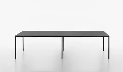 Imagine a table, the simplest of tables: a top and four legs; one in each corner. The minimalistic outline of this table is made of uniform aluminium profiles and finished with a thin solid core table top. Taking a closer look at the framework reveals the table’s modular construction: each corner has a solid aluminium corner joint connecting the extruded crossbars and legs. Very long tables would have two additional joints adding a fifth and sixth leg.