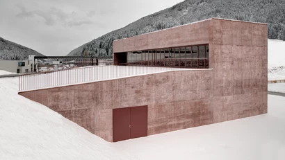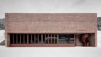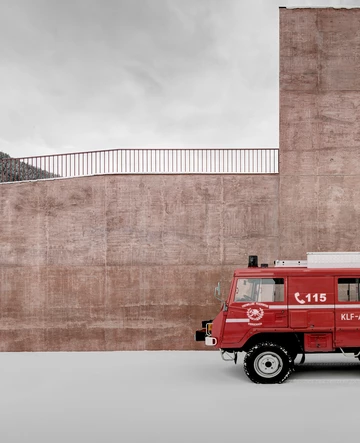 Fire Station Vierschach, located at 1,130 metres above sea level in the Hochpustertal valley, functions as both a fire brigade garage and a community event hall. Designed by Pedevilla Architects, the compact concrete structure features red architectural accents that signal its civic function.