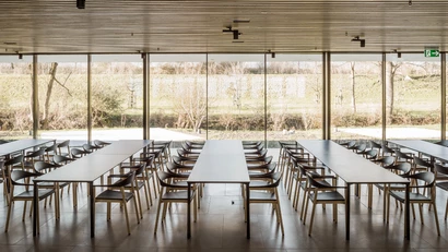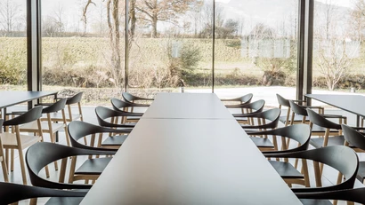 First Advisory Group Cafeteria in Vaduz, Liechtenstein, designed by Hildmann Loenhart Mayr Architekten, integrates functional dining and meeting zones within an austere, light-filled hall.