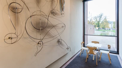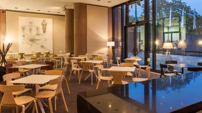 Kunsthalle Bielefeld features the new café “Johnson’s” inside the museum designed by Philip Johnson and completed in 1968. The room combines majestic architectural proportions and rich materials with modern furnishings. The space highlights a dialogue between the historic International Style architecture completed in 1968 and thoughtful lighting and renovation efforts since 2002.