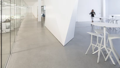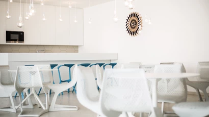 Pankl Racing Systems AG headquarters in Kapfenberg, Austria, includes a refined staff lounge and cafeteria area designed by Hofbauer Architects. The large windows and white-toned interior create an expansive, light-filled space that supports both relaxation and informal collaboration. It's a contemporary workplace environment where clarity of form and a calm atmosphere encourage productivity and connection.