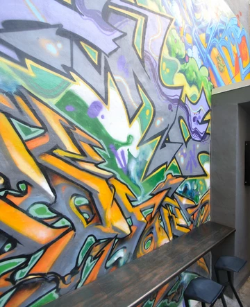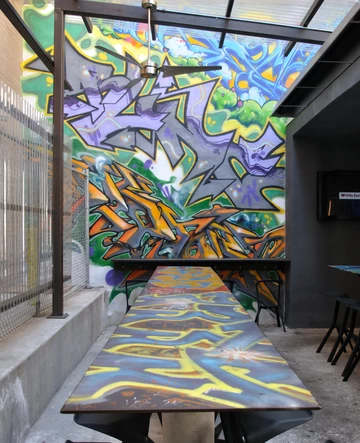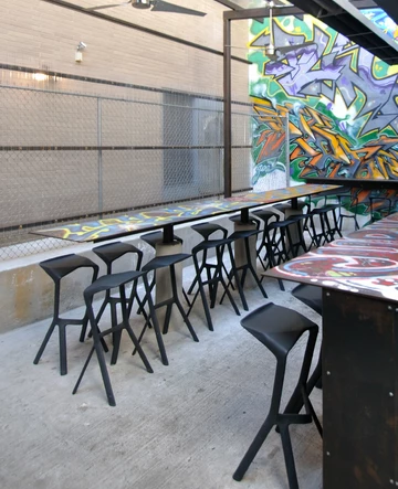 Sampan Graffiti Bar is a vibrant outdoor extension of the Sampan restaurant, located in Philadelphia’s Midtown Village. Tucked into a narrow urban courtyard and covered by a transparent canopy, the bar is framed by bold street art and designed to function throughout the year. It serves as a casual, social spot for after-work drinks, small gatherings, and sporting events in an atmosphere that blends informality with artistic expression.