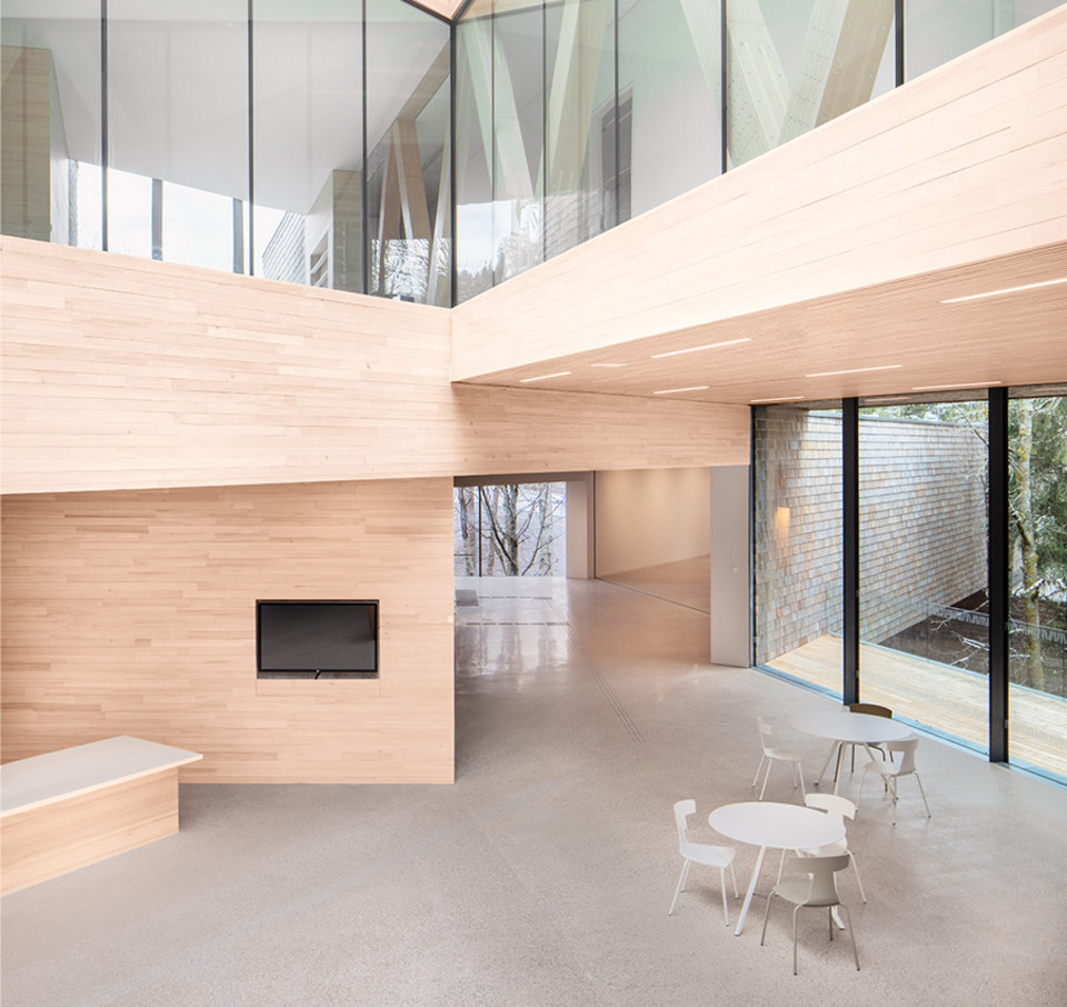 Das Besucherzentrum des neu gegründeten Nationalparks Schwarzwald auf dem Ruhestein, integriert sich mühelos in seine Umgebung und verhält sich aus den verschiedenen Perspektiven unauffällig. Die Analogie des Waldes wird in der Außenfassade durch die Holzschindelverkleidung und freiliegende Holzstrukturen aufgenommen.