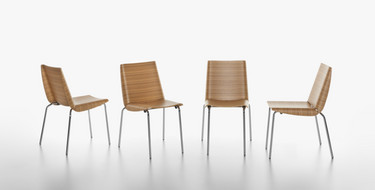 Stuhl stapelbar, Metallgestell verchromt, Sitz und Lehne in Formschichtholz mit Zebrano furniert.