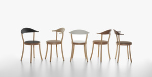 Stuhl, Gestell in Buche Natur lackiert oder Buche schwarz gebeizt, lackiert. Rückenlehne aus Polypropylen in den Farben Schwarz, Weiß, Caffelatte, Karamell, Terrabraun. Sitz aus flexiblem Polyurethan-Integralschaum.