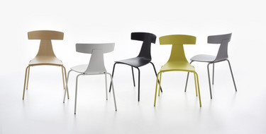 Formholzstuhl in Esche Natur oder offenporig decklackiert in den Farben Weiß, Grau, Schwarz oder Gelb. Metallgestell pulverbeschichtet in der Farbe der Sitzschale. Stapelbar.