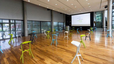 Das war in der Tat sehr komplex, da nach unserem ersten Gespräch mit dem Veranstaltungsort klar wurde, dass aufgrund der Beschränkungen so ziemlich alles verboten war. Das hat uns umso mehr angespornt auf Kreativität zu setzen. Wir durften beispielsweise keine klassischen Stehtische verwenden, so haben wir alle Teilnehmer mit einem Barhocker MIURA stool von PLANK ausgestattet, auf dem sie essen, sitzen, schreiben oder auf dem sie ihre Unterlagen oder ihr Tablet ablegen konnten. Das war nicht nur eine funktionale Lösung, sondern vor allem auch eine, die es uns ermöglicht hat den Raum mit bellezza zu füllen.