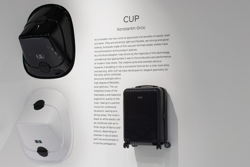 Als Reisender hat man die Vorteile von Kunststoffschalenkoffern schätzen gelernt. Sie sind extrem leicht und flexibel, gleichzeitig sehr resistent und sehen gut aus. Koffer aus dünnen thermogeformten Kunststofffolien haben eine ganze Produktspezies verändert. Als Möbeldesigner war ich von der Genialität dieser Technologie ergriffen und befand, daß sie sich ideal für die Produktion und Funktion moderner Sitzschalen anwenden ließe. Das kreative Potenzial schien offensichtlich, das Übersetzen in eine erfolgreiche Formel für einen Stuhl brauchte jedoch Zeit und Tests. Mit CUP haben wir eine elegante Geometrie für die Schale entwickelt, die strukturelle Festigkeit mit einem hohen Grad an Flexibilität und Leichtigkeit kombiniert. Die gepolsterte Seite der Schale trägt zur ausgewogenen Ergonomie des Stuhls bei und ist somit die perfekte Wahl für Konferenzsituationen, Wartebereiche und Restaurants. Die Schale aus schwarzem oder weißem Kunststoff kann mit einer großen Auswahl an Stoffen und Farben kombiniert werden, je nachdem, ob sie sich mit der Einrichtung verbinden oder Protagonist sein soll. (Konstantin Grcic).